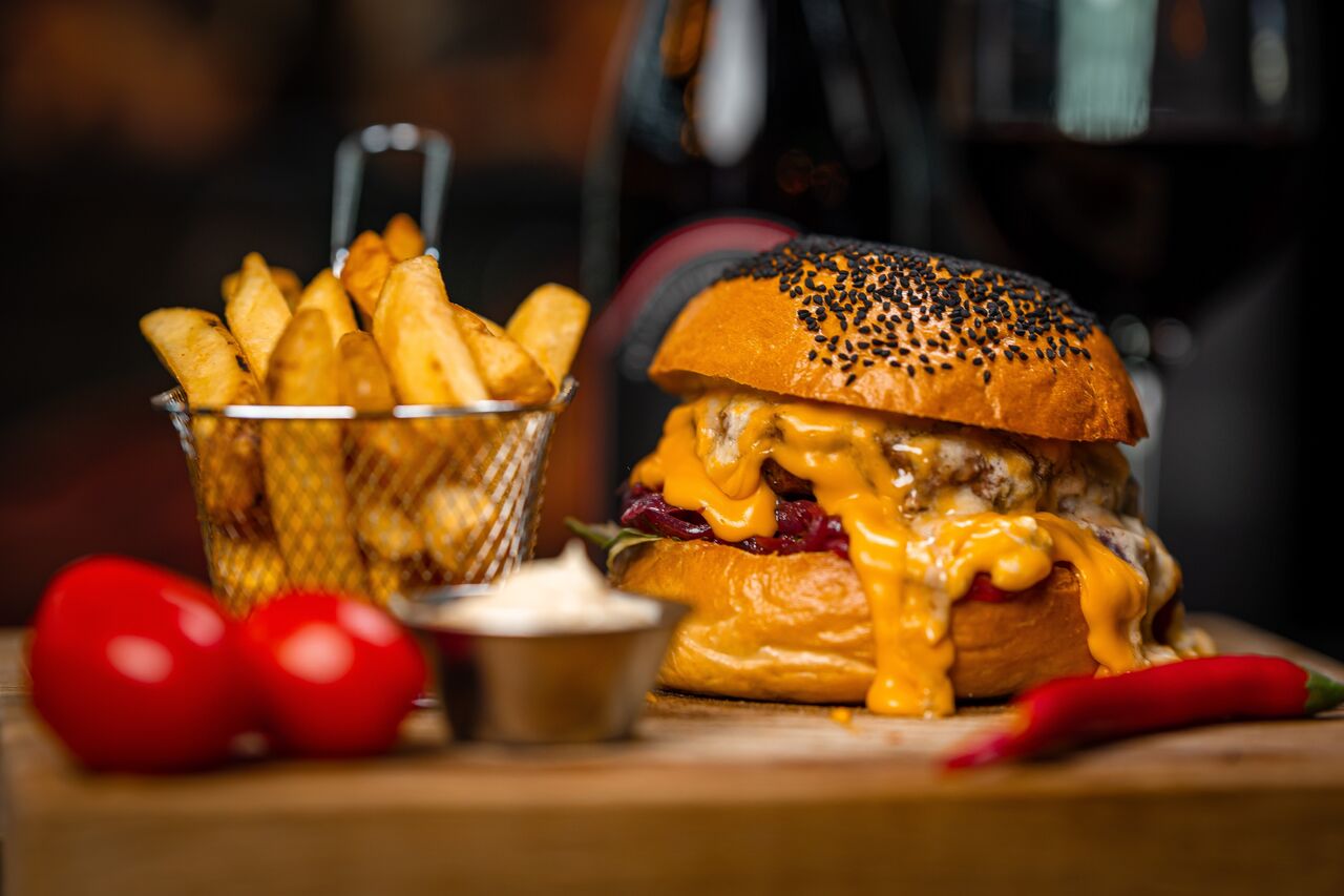 Wołowina 180 g, bułka pszenna, pikle, sałata, pomidor, cebula, sos aioli / Rindfleisch 180 g, Weizenbrötchen, Gurken, Salat, Tomate, Zwiebel, Aiolisauce.