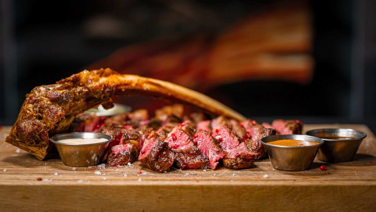signature Tomahawk ca. 1.2 kg. All steaks are served with baked potatoes and herb butter.