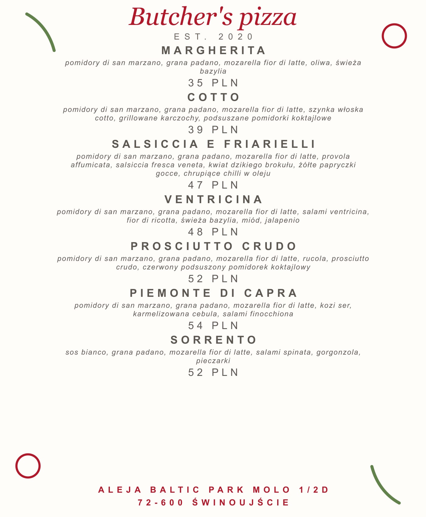 Butcher's pizza est. 2020 with San Marzano tomatoes, fior di latte mozzarella and Italian toppings.